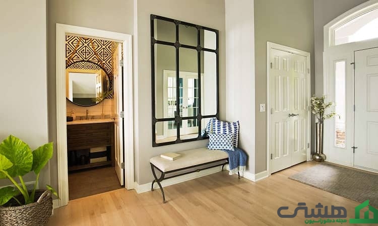 قرار دادن آینه در مکان استراتژیک: در ورودی باریک و کوچک، قرار دادن آینه در مکانی استراتژیک میتواند موجب انعکاس نور و احساس بزرگتر بودن فضا را به بیننده بدهد. میتوانید آینه را در جایی قرار دهید که انعکاسی از فضای دیگری در خانه را نشان دهد که باعث میشود احساس کنید فضا عمق بیشتری دارد.