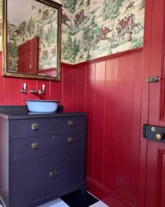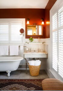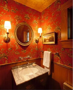 تا اینجای کار در مورد نصفه عمل کردن بر روی دیوارهای سرویس بهداشتی زیاد صحبت کردهایم. در تصویر زیر کاغذدیواری و پنلهای چوبی قرمز موجب خیره کنندگی سرویس بهداشتی شده است.