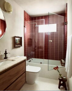 سنگ تراتزو همه جا در حال استفاده است. پس میتوانیم نیمی از دیوار را با سنگ تراتزو و نیمی دیگر را به رنگ قرمز یا سرخابی در بیاوریم. میبینید که برای کنترل و محدود کردن دیگر عناصر از دیواری شیشهای برای جدا کردن دوش از دیگر فضاها استفاده کردیم.