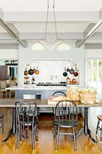 در عکس زیر دیوارهایی که به رنگ سبز نعنایی بسیار ملایم و جزیره خاکستری تیره با پارکت چوبی آن را به آشپزخانهای ویکتوریایی تبدیل کرده است. اما لوستر دو شاخهای حس و حال کتابخانههای قدیمی را به محیط میدهد.