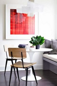 اگر اتاق ناهارخوری شما کوچک است ولی همچنان دوست دارید که لوستری بزرگ بخرید، ما اینجا هستیم که به شما کمک کنیم. در اتاق ناهارخوری زیر از یک نیمکت و دو صندلی برای نشستن استفاده شده است. تابلوی قرمز و تاثیرگذاری که بالای میز نصب شده فضا را برای نصب یک لوستر با اشکال هندسی آماده میکند.