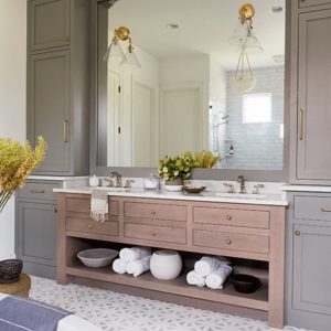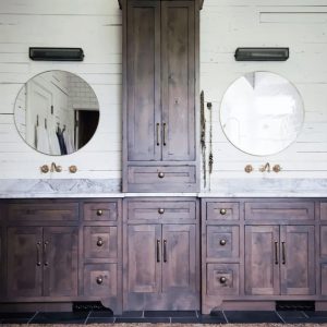 در تصویر زیر میببینید که چطور چراغهای مستطیلی که بالای آیینههای گرد نصب شدهاند، بوسیلهی فرم، زیبایی بصری ایجاد کردهاند. استفاده از متریالهای متفاوت باعث زیباتر شدن این سرویس بهداشتی شده است. چوب، مرمر و برنز، همه و همه به زیبایی این فضا کمک کردهاند.