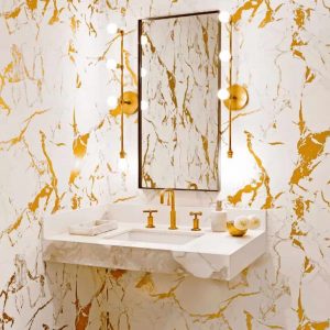 در تصویر زیر، چراغهای دیواری برنجی که دو طرف آیینه را گرفتهاند همراه با شیرآلات برنزی، و کاغذدیواری با طرح طلایی، محیط گرمی را بوجود آوردهاند. پس هنگام خرید منبع نور حتما به رنگ دیوارها دقت کنید تا تاثیرگذاری بیشتری داشته باشد.